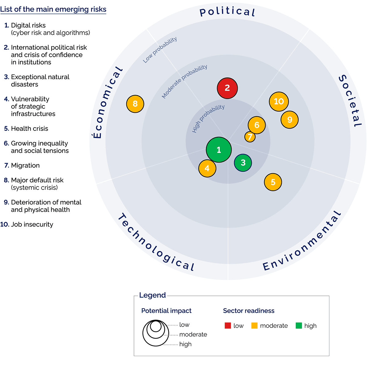 Our experts continuously monitor emerging risks through a forward-looking watch system. Each year, emerging risks are classified according to their potential impact and occurrence. For 2023, the overview of identified risks provides a global view of the challenges that lie ahead.