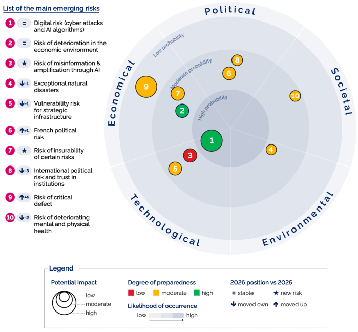Our experts are continuously monitoring emerging risks through forward-looking intelligence gathering. Each year, these risks are classified according to their potential impact and their likelihood of occurrence. For 2026, the overview of identified risks provides a global picture of the challenges that lie ahead.