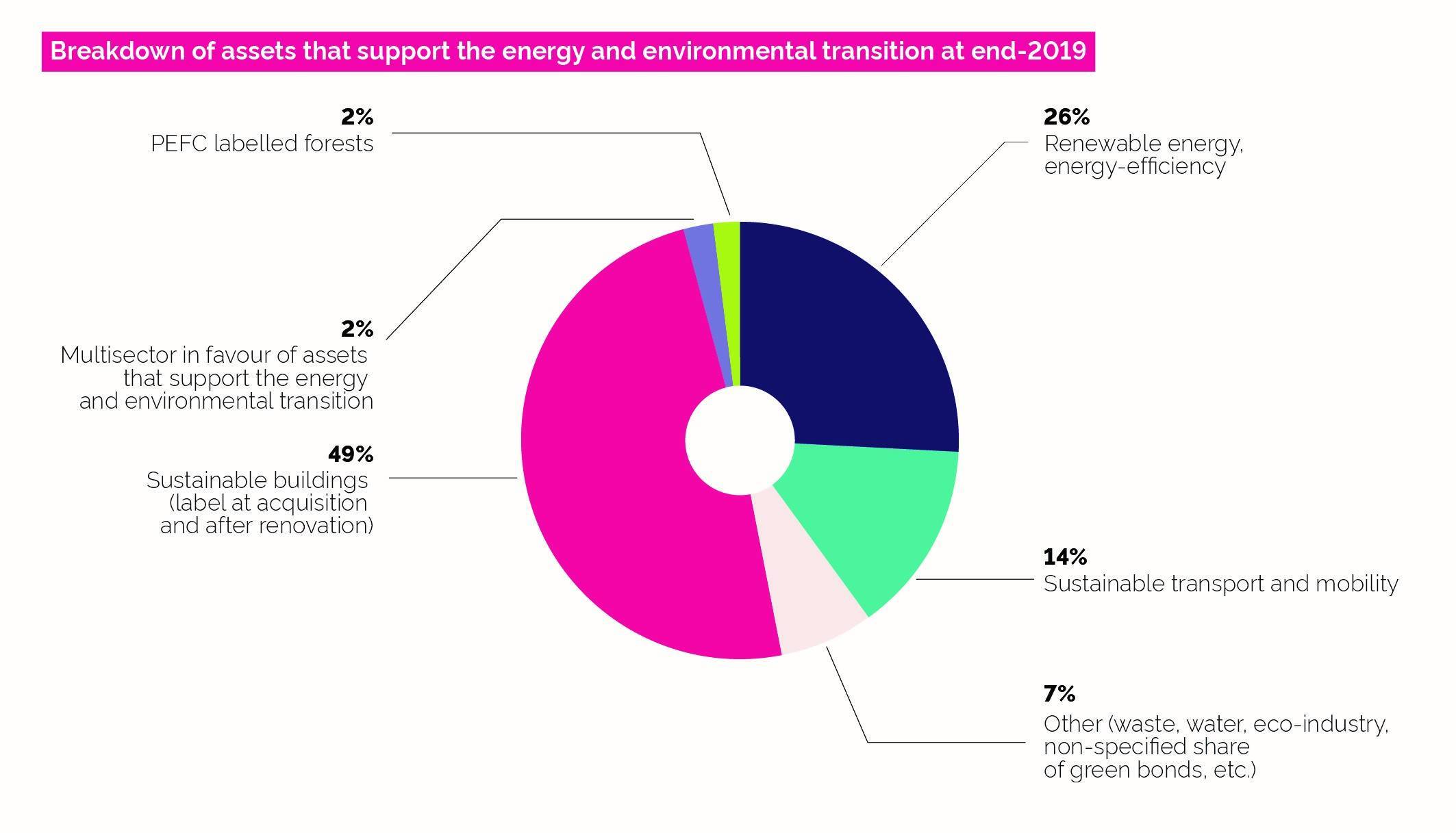 In 2019, CNP Assurances announced that it plans to double its assets under management in green investments - forests, green bonds, high energy performance buildings, green infrastructure such as renewable energy projects and low-CO2 transport and mobility – to €20 billion by the end of 2023, from €10.4 billion at the end of 2018. At the end of 2019, these green investments reached €14.4 billion: 49% relate to sustainable buildings, 26% to renewable energy and energy efficiency, and 14% to transport and sustainable mobility.