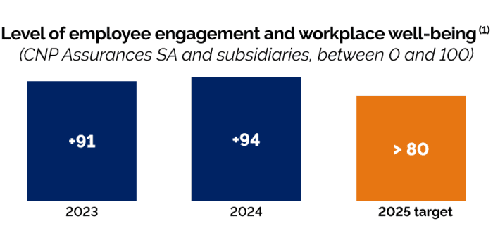 By the end of 2025, we aim to achieve a level of commitment and well-being among our employees of 80 on a scale of 100 in France and internationally.
