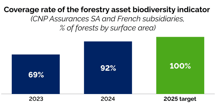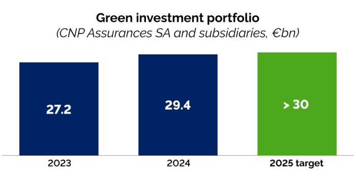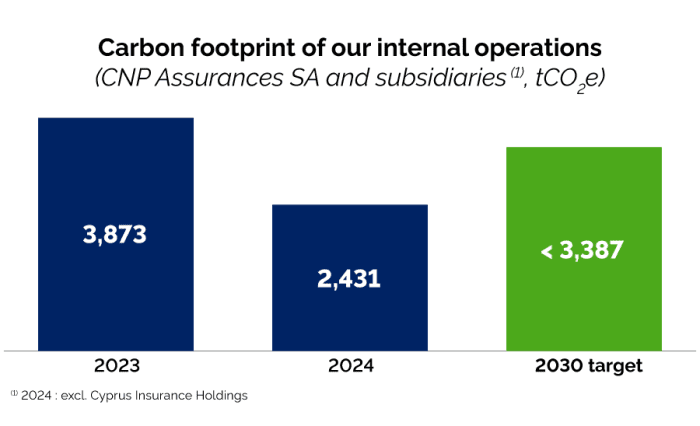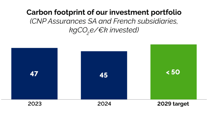 Between 2019 and 2023, the carbon footprint of our investment portfolio decreased by 56%. CNP Assurances has exceeded the Net-Zero Asset Owner Alliance target of a 25% reduction between 2019 and 2024.