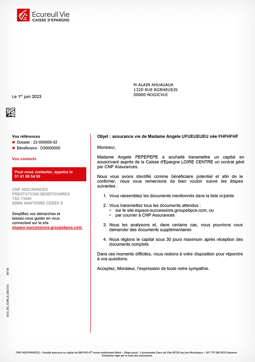 Votre qualité de bénéficiaire sera confirmée après analyse des documents reçus par CNP Assurances.